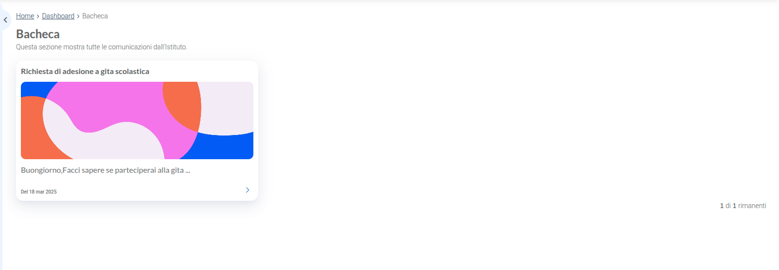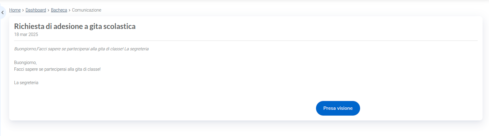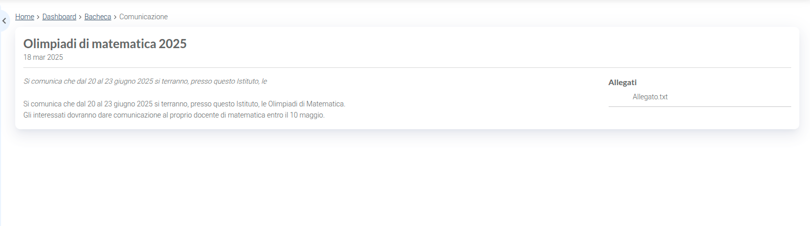 Cliccando su una comunicazione ne vengono mostrati i dettagli, tra cui la data di emissione, il testo, gli eventuali allegati e l’eventuale scadenza.